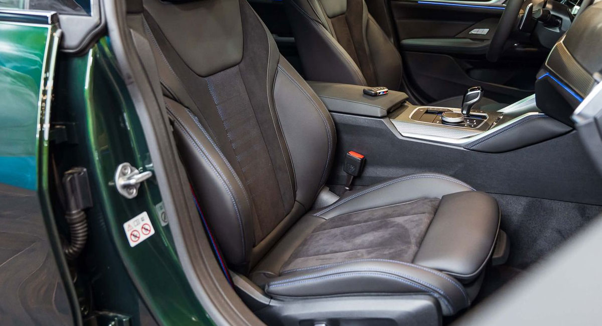 Bộ ghế phối da Sensatec và phần giữa là da lộn, thiết kế thể thao. Chỉ thêu tương phản màu xanh; họa tiết trang trí M làm điểm nhấn trên lưng ghế. Ghế trước chỉnh điện 2 chế độ nhớ. Ngoài ra thì seatbelt cũng là loại M Sport, chỉ thêu 3 màu M chạy dọc dây đeo rất đẹp và nổi bật.