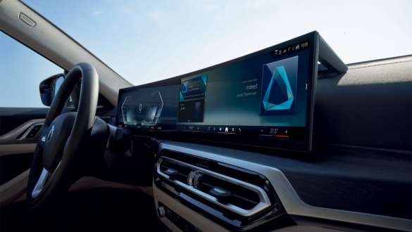 Màn hình cong BMW mới trong BMW i4 kết hợp cụm màn hình công cụ 12,3″ với Màn hình điều khiển lớn 14,9″ để tạo thành một đơn vị hiển thị hiện đại cong về phía người lái.
