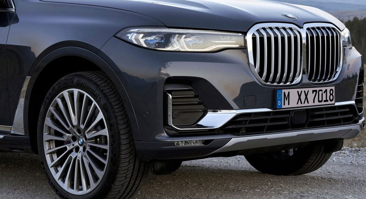 BMW cho biết X7 thế hệ đầu tiên là chiếc xe sở hữu lưới tản nhiệt lớn nhất từ trước đến nay của BMW. Trong khi đó, cụm đèn pha BMW Laserlight nối liền lưới tản nhiệt được thiết kế khá mảnh cho khoảng cách chiếu sáng tối đa tăng lên đến 600m. Hốc gió trước mở rộng ra hai bên tích hợp đường viền mạ crôm cùng cản trước được tạo dáng khác góc cạnh tôn lên sự mạnh mẽ, hầm hố của xe.