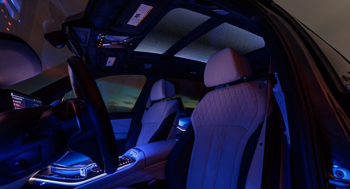 Trần xe BMW X7 còn có cửa sổ trời toàn cảnh Panorama Sky Lounge với 2 khu vực tách biệt. Qua đó, cửa sổ trời sẽ được tích hợp 15.000 điểm LED phát sáng tạo ra bầu trời sao khi về đêm lấy cảm hứng từ những mẫu xe xa xỉ Rolls Royce.
